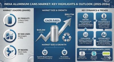 According to the latest report by The Report Cube, study India Aluminum Cans Market is anticipated to register a CAGR of 9.65% during 2026-2034. The market size was valued at USD 415.8 million in 2025 and is projected to reach USD 952.71 million by 2034. Aluminum cans are steadily gaining preference across beverage, food, and personal care industries due to their lightweight structure, high recyclability, and superior barrier properties.