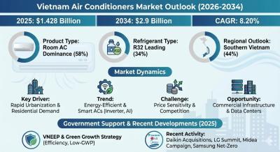 According to the latest report by The Report Cube, study Vietnam Air Conditioners Market is anticipated to register a CAGR of 8.20% during 2026-2034. The market size was valued at USD 1.428 billion in 2025 and is projected to reach USD 2.9 billion by 2034. Air conditioners have transitioned from luxury appliances to essential household and commercial infrastructure across Vietnam, supported by rising temperatures, urban expansion, and increasing disposable incomes.