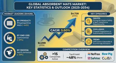 According to the latest report by The Report Cube, study Absorbent Mats Market is anticipated to register a 5.60% during 2026-2034. The market size was valued at USD 2.89 billion in 2025 and is projected to reach USD 4.72 billion by 2034. The market is witnessing robust growth driven by increasing industrial safety awareness, stricter environmental regulations, and rising workplace spill management requirements. Industrial facilities, warehouses, food processing plants, and healthcare institutions are increasingly deploying absorbent floor mat and absorbent mat solutions to comply with occupational safety standards.