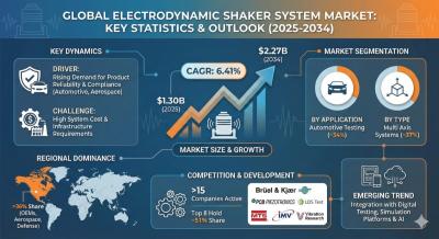 According to the latest report by The Report Cube, study Electrodynamic Shaker System Market is anticipated to register a 6.41% during 2026-2034. The market size was valued at USD 1.30 billion in 2025 and is projected to reach USD 2.27 billion by 2034. The market is witnessing strong growth driven by increasing demand for vibration and shock testing across automotive, aerospace, electronics, and defense industries. Electrodynamic shaker systems are widely used to simulate real-world vibration environments, ensuring product durability, reliability, and compliance with international quality standards.